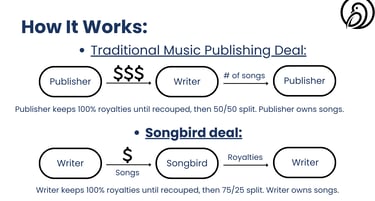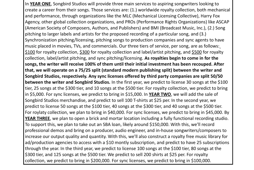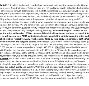 At the third tier of our Song Services, we will actively work to get original music placed in film, TV, and ads; what's known as "Synchronization licensing." These placements result in fees for the use of the song, of which the writer and Songbird Studios split 50/50. The previous royalty deal still applies.