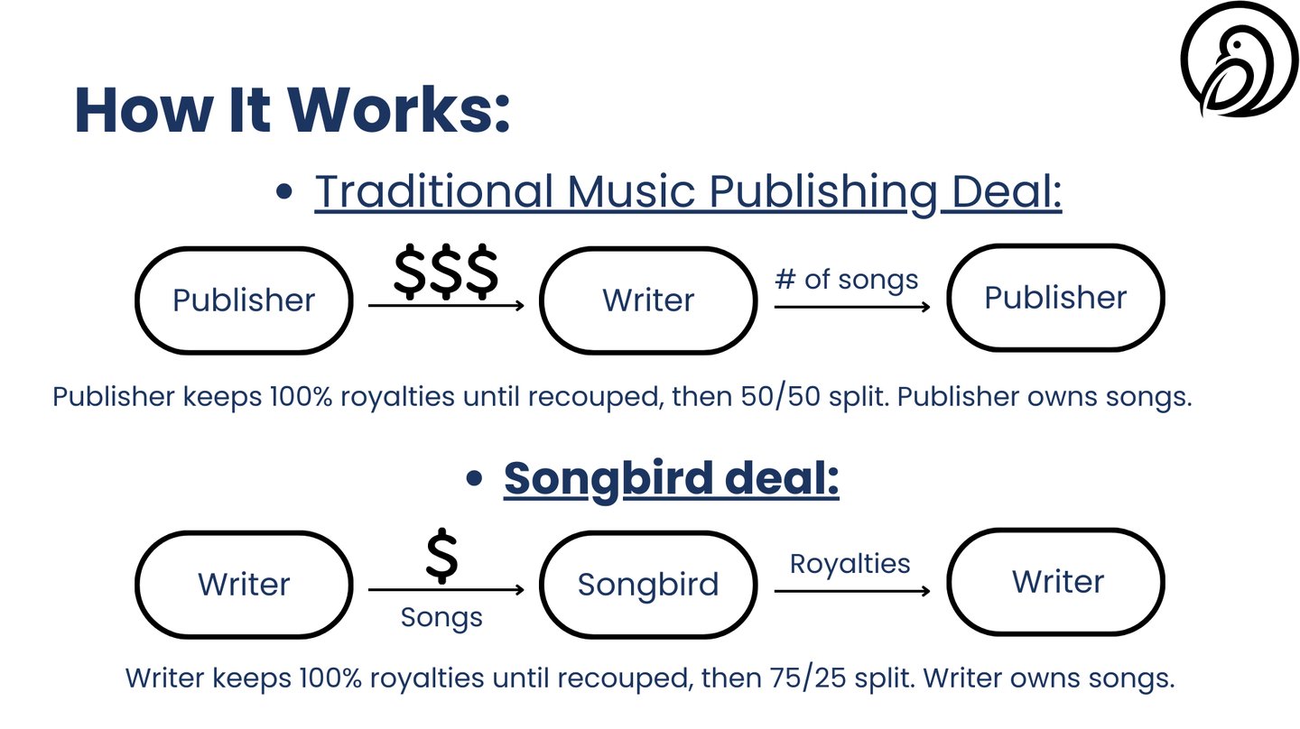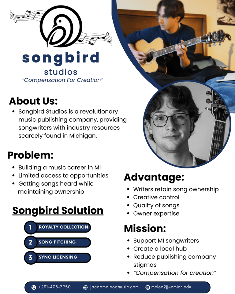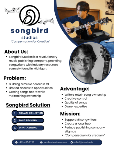 Songbird Studios is the progressive music publishing company that supports local songwriters. Our goal is to provide access and opportunities for Michigan based songwriters to get their original music recorded, used, and heard. Through placements in movies and TV, recordings done by other artists, and consistent royalty payouts, we make the idea of building a career around songwriting possible. With an alteration on the traditional music publishing deal, Songbird Studios hopes to revolutionize the Michigan music industry, providing compensation for creation while building a sustaining music community.